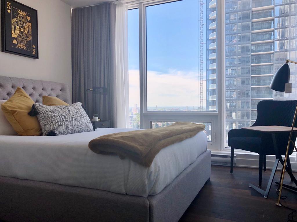 Modern bedroom with city view and chair.