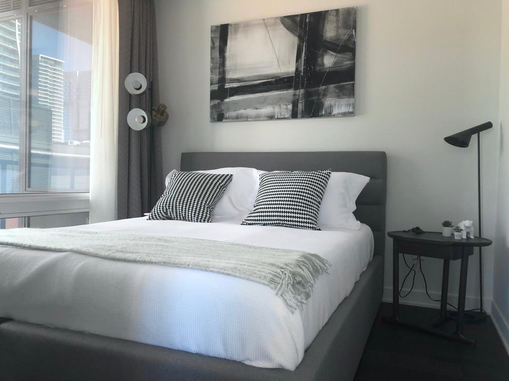 Modern bedroom with bed and artwork.