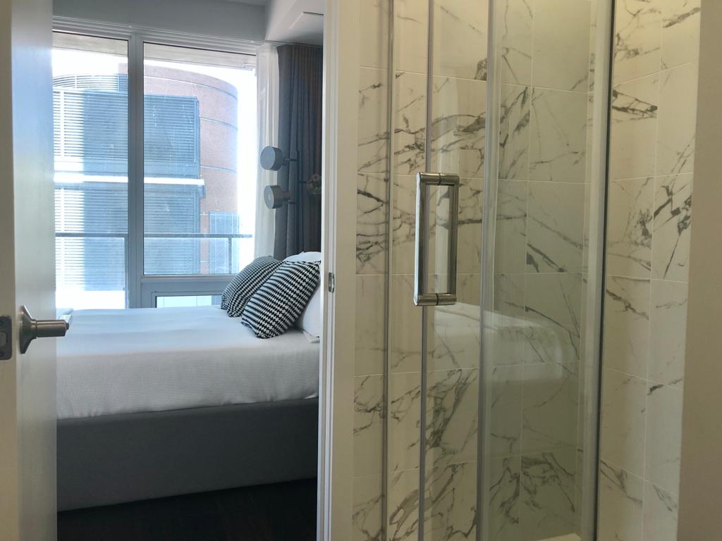 Bedroom view with adjacent glass shower enclosure.