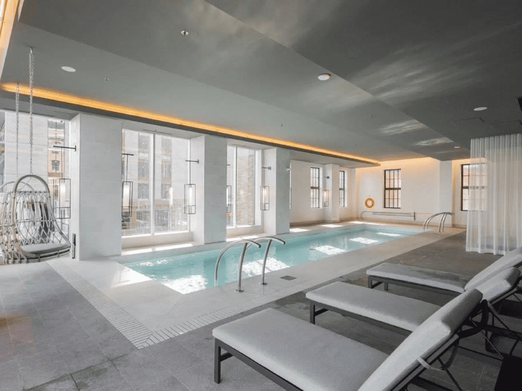 Indoor pool with lounge chairs and swing.