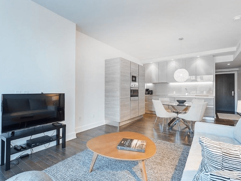Modern open-plan living room and kitchen.