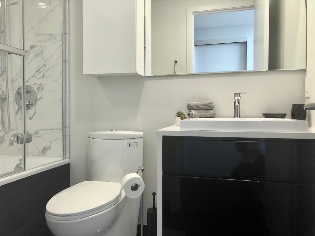 Modern bathroom with toilet and sink.